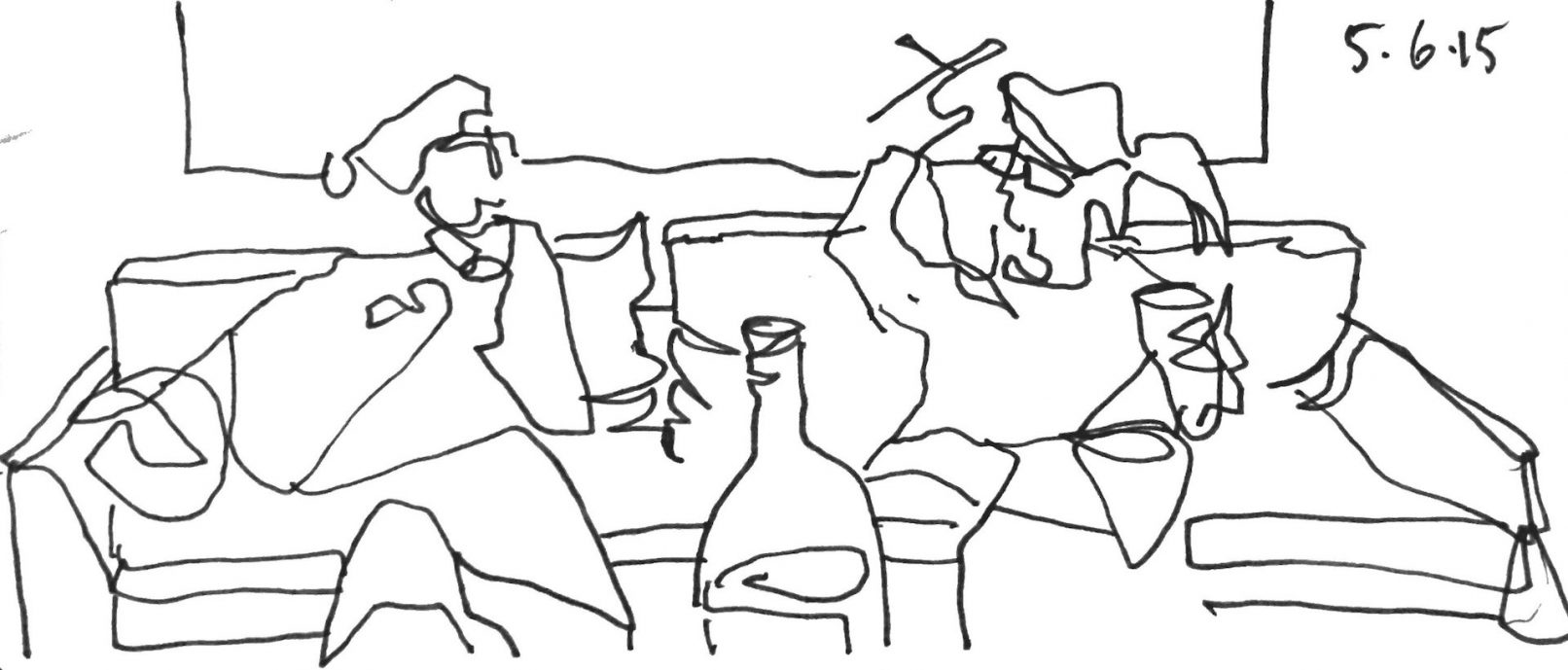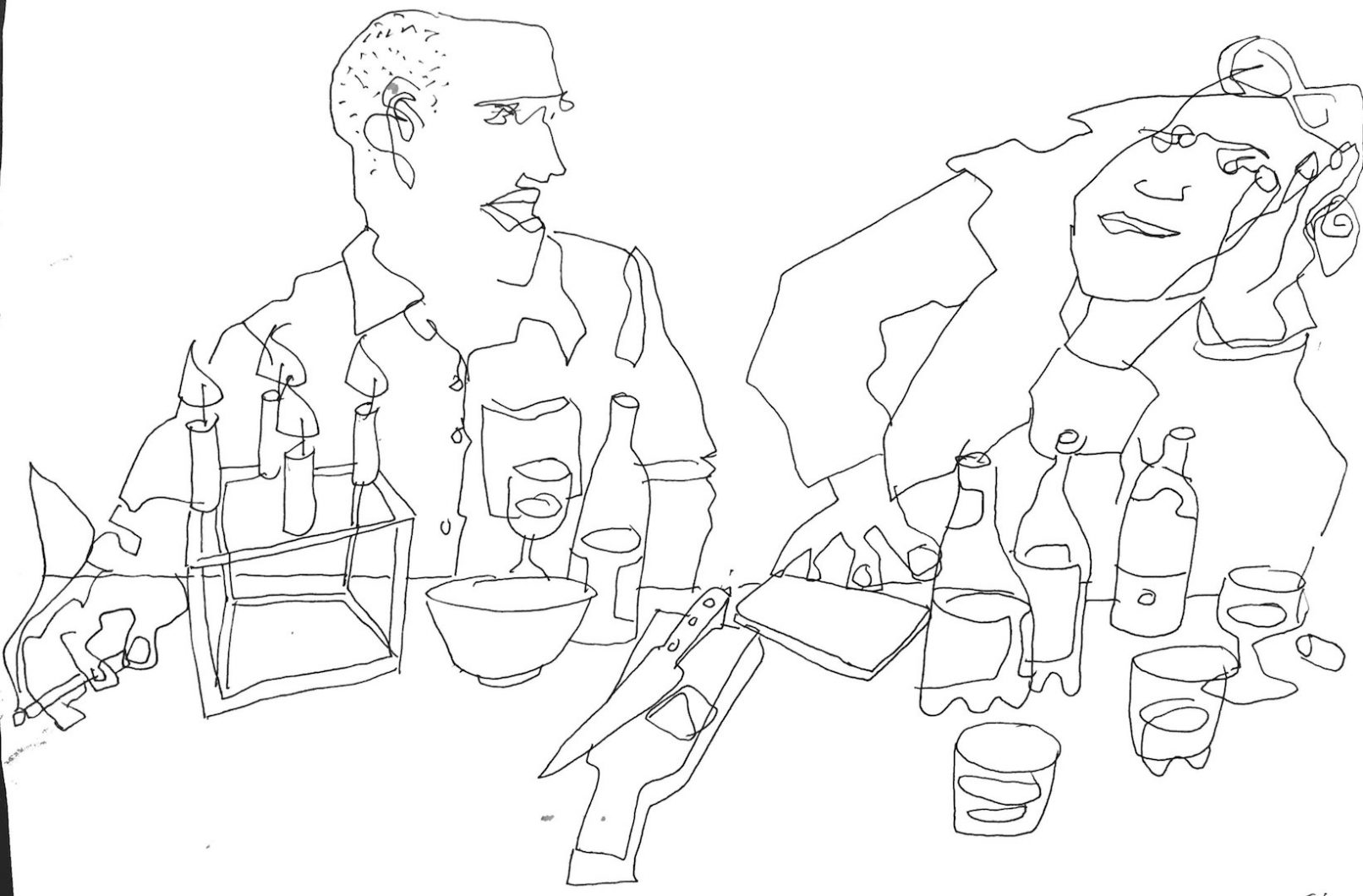Stephen Harty makes observational line drawings, often at tables.
