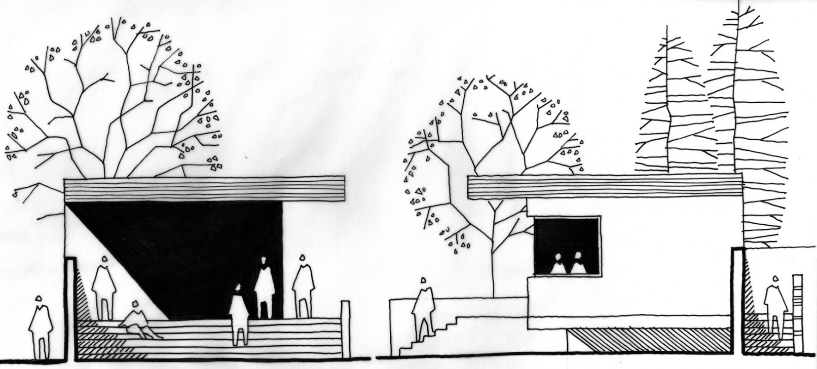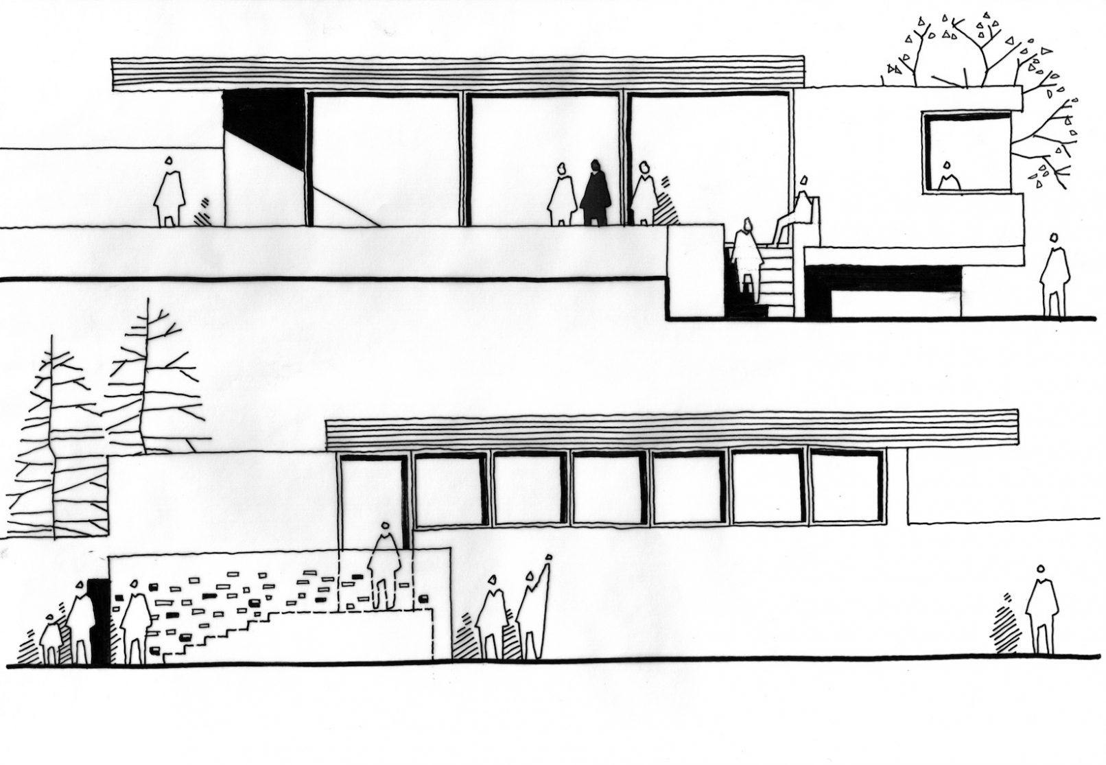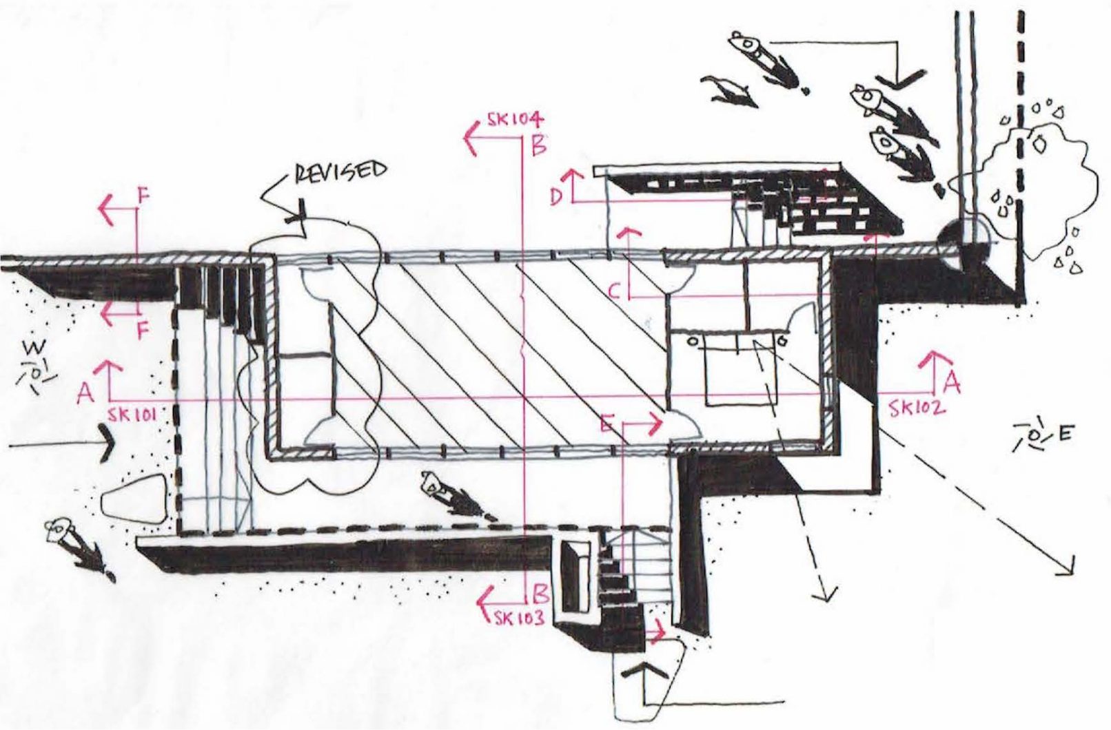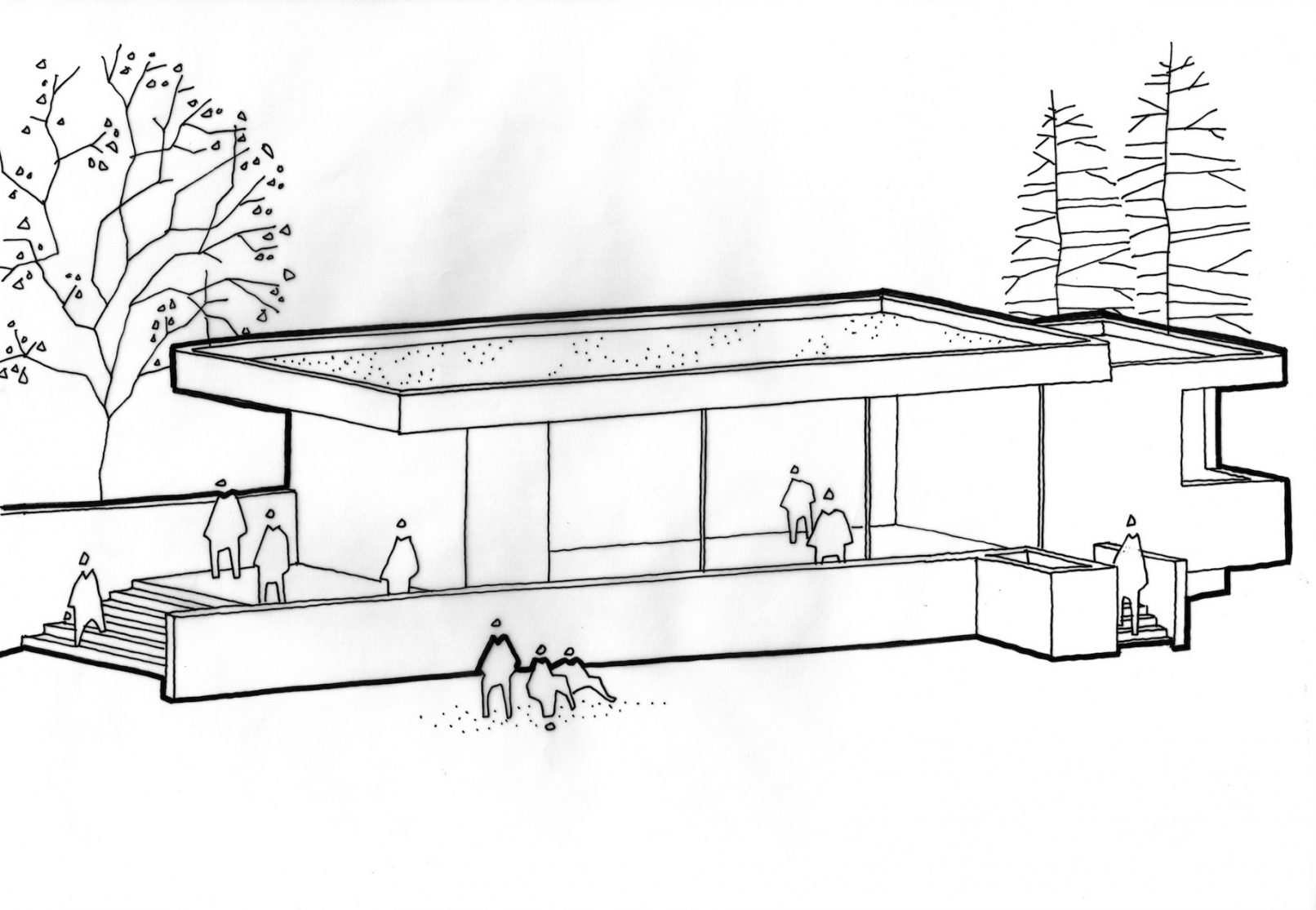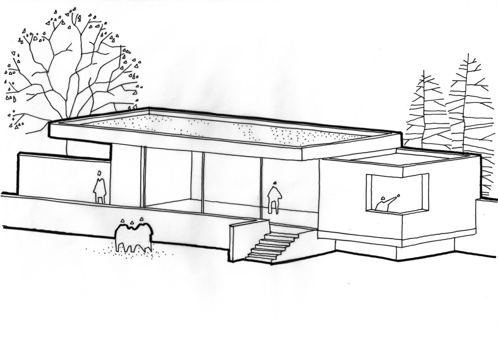 Following the completion of the works to The Rookery House in Norfolk, we began a new project to enclose the large walled garden, by re-instating the 4th wall to the South and constructing a new artist’s studio building. Formed as part of the garden walls, similar to the potting sheds to the West, the new building is a raised concrete structure. Clerestory glazing above the wall provides quality working North light. To the river and the South, the glazing is shaded by the over-sailing roof. The bedroom is positioned to the East for morning light. Terraces and steps lift the building above its marshland context. The new brick wall continues into the building and the distinction between landscape, walling and interiors is blurred. The cantilevered roof is planted to appear as part of the landscape from the house. The off-set roof presents an idea of movement, weight and balance.