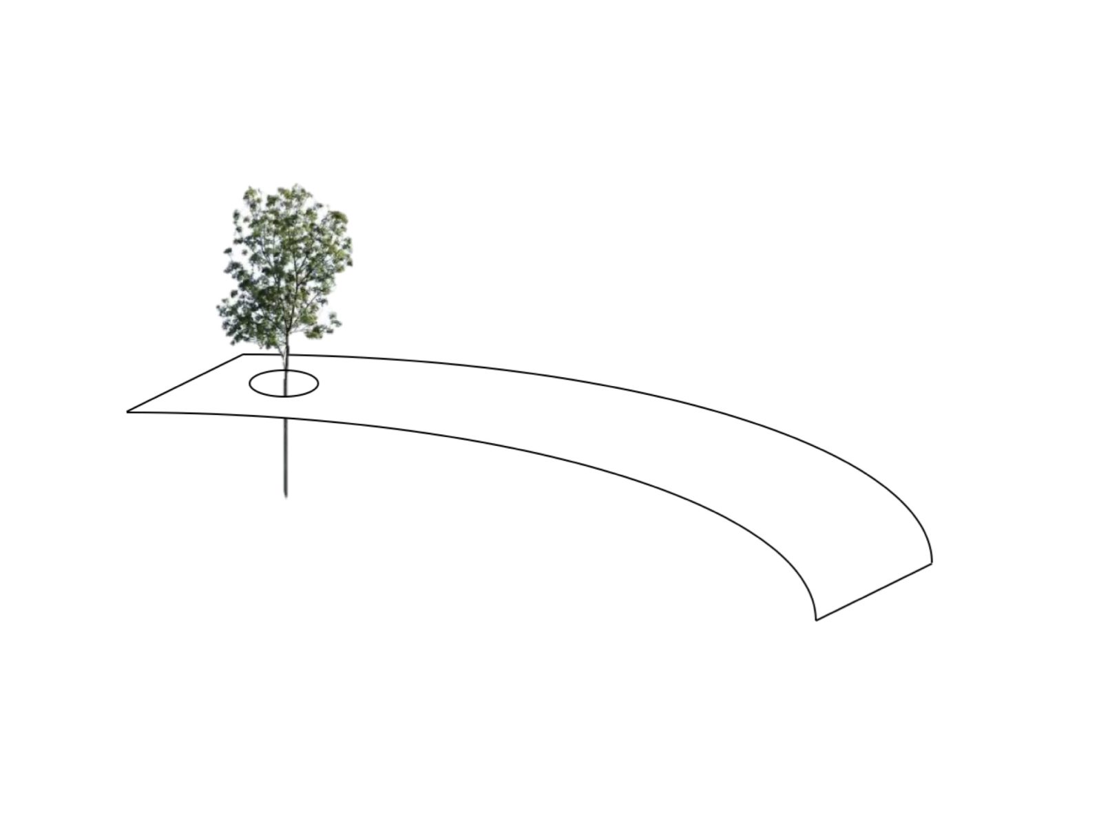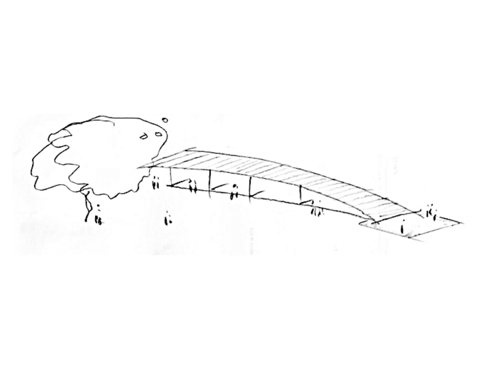 The building form is slim and rises from the ground in a gentle arc making a close relationship with the land at the low end and the sky at the other, where a tree breaks the roof line. Both are poetic gestures and design ideas to bed-in the building to its context and create peaceful places where landscape and architecture blend.